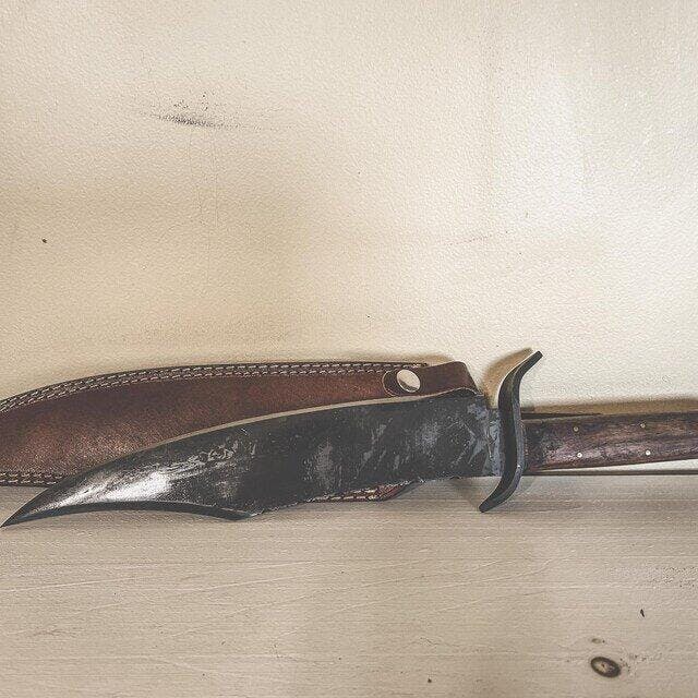 Juan Padillo bowie knife replica describes a handmade long-blade design created to echo classic bowie geometry with a forged spring steel blade and rosewood handle. This configuration follows the proportions of historical large bowie patterns, with an overall length of approximately 18 inches and a distinctive clip section measuring about 5.5 inches. The design uses a 4mm thick blade, a forged guard, and a full-length handle format that supports strong structural continuity from tang to butt. Collectors recognize this type of knife as a vintage-style piece that fits frontier, historical, and replica-focused collections.